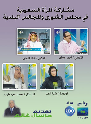 مشاركة المرأة السعودية في مجلس الشورى و المجالس البلدية. برنامج مباشرة مع مرسال غانم. 3 – 10 – 2011 {bo_videojs width=[640] height=[264] video_mp4=[http://al3aridh.org/mov/lbc.mp4]}